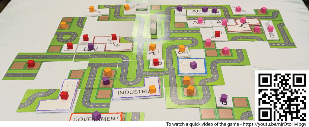 Scoring can happen on other player’s properties so placement and timing is very important. From only 2 choices each turn, lots of strategy develops around road connections and building placement.